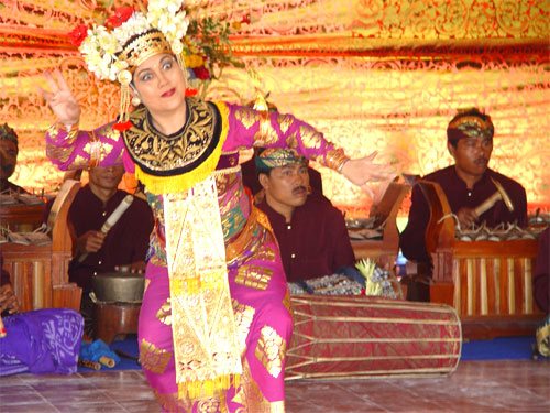 The last evening featured the female equivalent to the "Genjek". The traditional name is "Joged Bumbung". The dancers were elaborately dressed in gold fabric and their female coyness mixed with choreographed movement evolved, as with the genjek, into seaching the audience for an honored "chosen one". The object here is to find a way to physically touch the dancer, the problem is that she is armed with a fan that she skillfully uses as a physical advancement deterant. The music would rise and fall and reflect the movement of both parties creating a sureal battle of music and dance. Some locals who were familiar with the ceremony of dance protocol would entice and trick the dancers and eventually enact a ritualistic beating. The dancer would stay in a stagnant submissive pose on the ground and the crowd would revel in the cunning of the triumphant aggressor. Throughout the evening, the dancers strategically brought up all participating artists and masters from abroad to dance with them. The effect was an awe inspiring melding of the multi-cultural which transcended and broke all artistic barriers. This cultural practice of Joged Bumbung seemed to be a favorite of the locals and foreigners alike which bonded everyone into a multi-cultural village of world cultures.