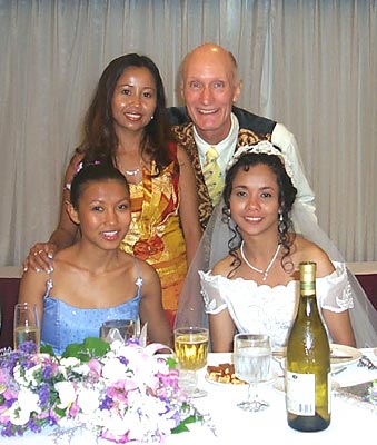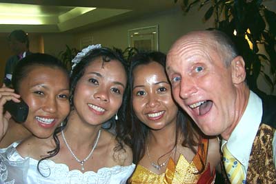 These 3 young ladies were among the older children adopted from Cambodia in the program created by Daniel and Lauryn in 1990. Sophia Budar (in blue), the Maid of Honor, is on the phone with Prom Gould in Hawaii (also adopted in 1990) whose own wedding party was taking place at the same time. The "Lady in Gold" is Naomi ("Anew") Pizzino. Happy times!